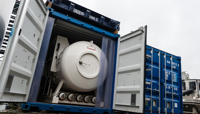 De decompressietank met een diameter van 1600 mm is gestationeerd in een 20 ft container. De royale lagedruk ademluchtcompressor maakt de decompressietank geschikt voor oppervlaktedecompressies en instructiedoeleinden. De container is te vervoeren met onze eigen vrachtwagen. De decompressietank voldoet aan de WOD-SOE en de IMCA regelgeving.