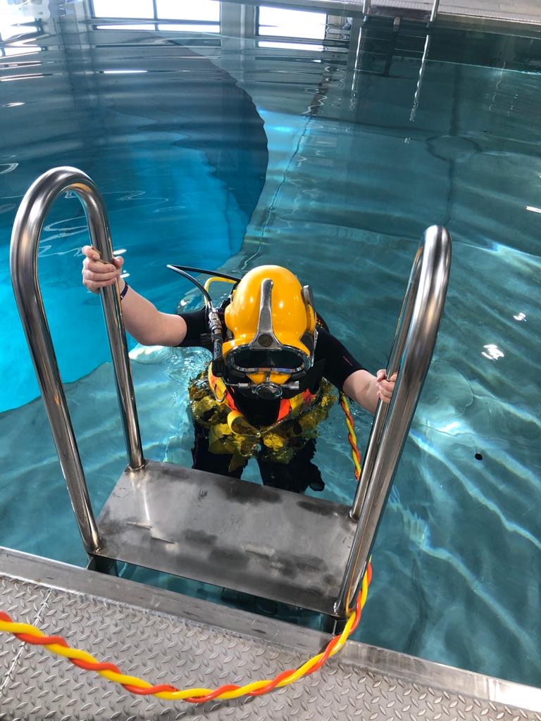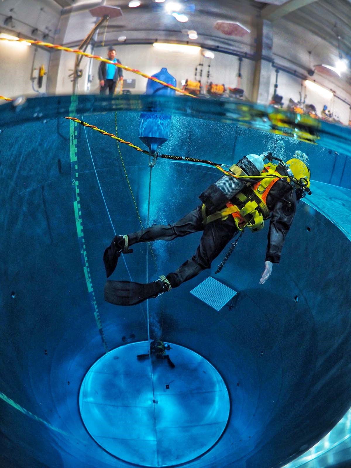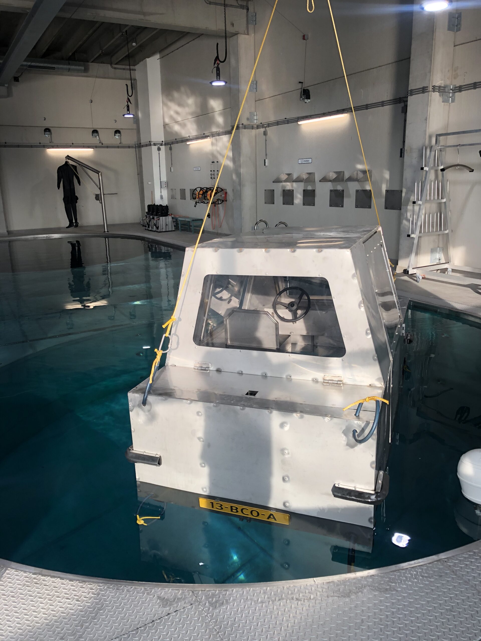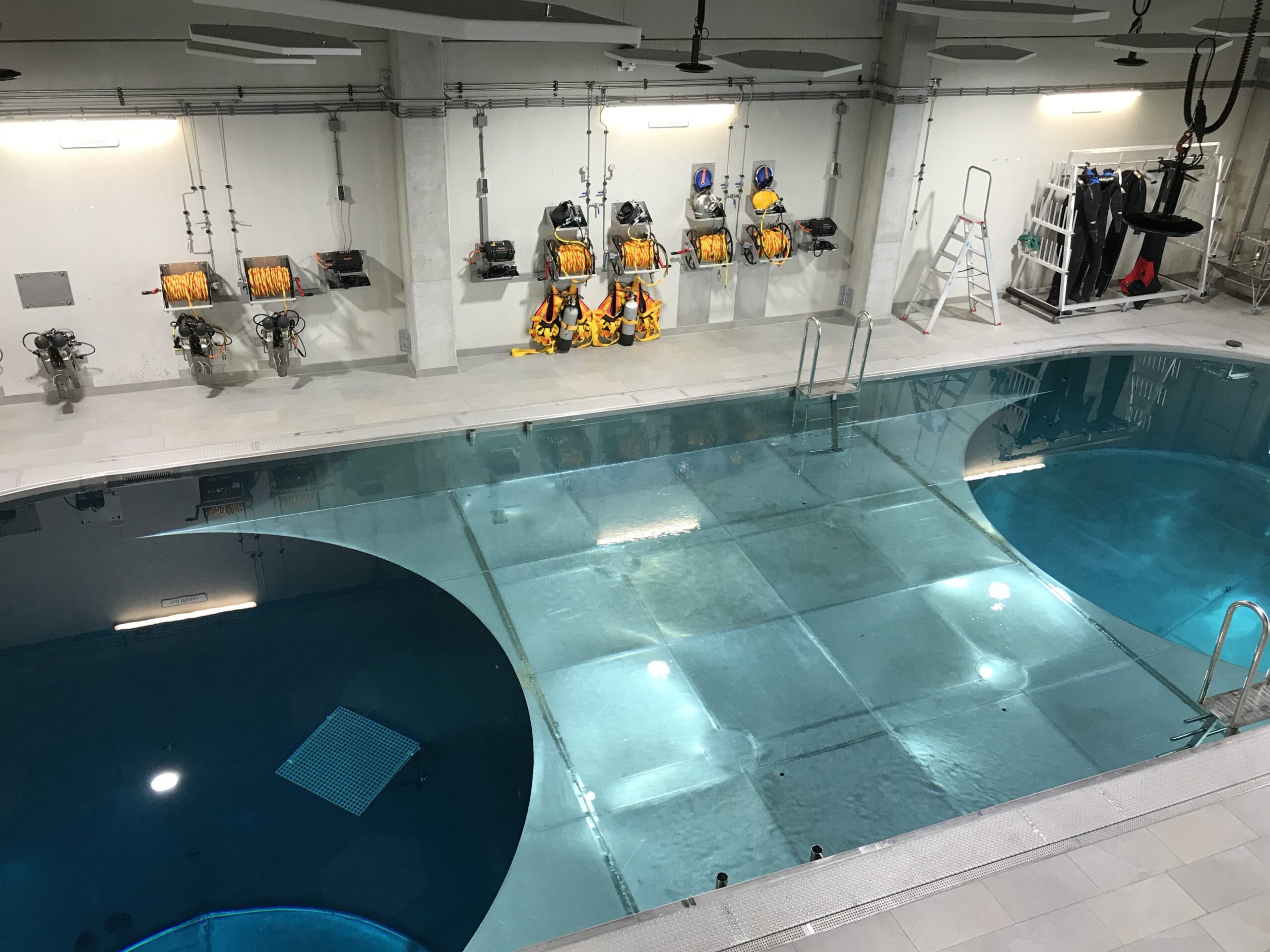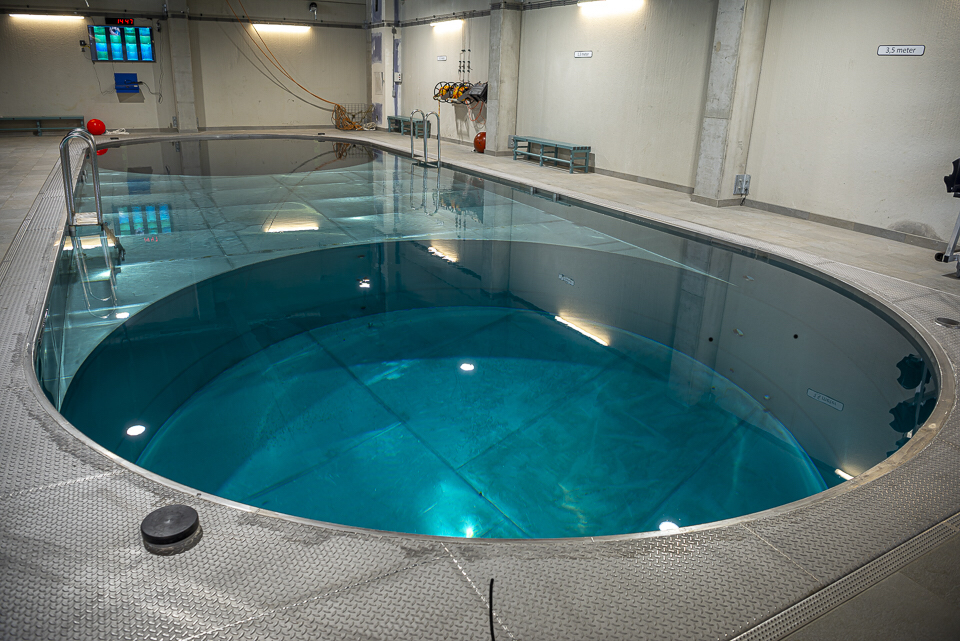 Het binnenwaterbassin is ingericht met praktische middelen om specifieke vaardigheden te trainen. In de wanden zijn 22 camera’s gemonteerd die op verschillende diepten de handelingen van de duiker vastleggen. Deze beelden worden later gebruikt bij evaluaties. Met een bovenloopkraan zijn zware instructiemiddelen in de bassins te plaatsen.